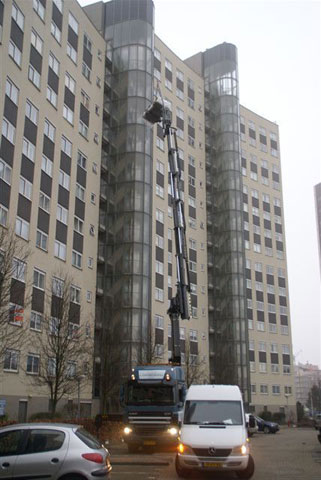 Met onze kranen van 14 tot en met 80 tm kunnen we grote hoogtes bereiken want onze kranen hebben een mastlengte tot 32 meter. We plaatsen zowel op daken als ramen in de hogere verdiepingen van appartementen, hetzelfde geldt voor zonneschermen. Die takelen we naar boven zodat ze terplekke door de specialist bevestigd worden.