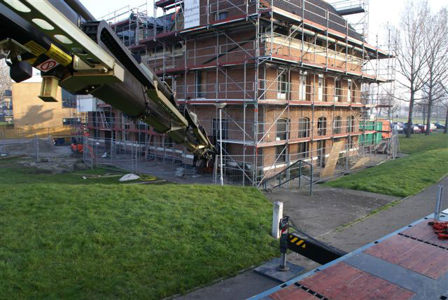 Het plaatsen van stalen balken in het pand vanaf de dijk.